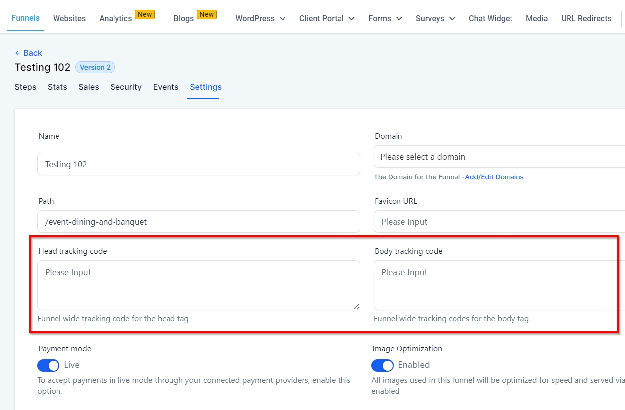 Access Funnel Settings: Click on "Settings" and look for the "Head Tracking Code Section".