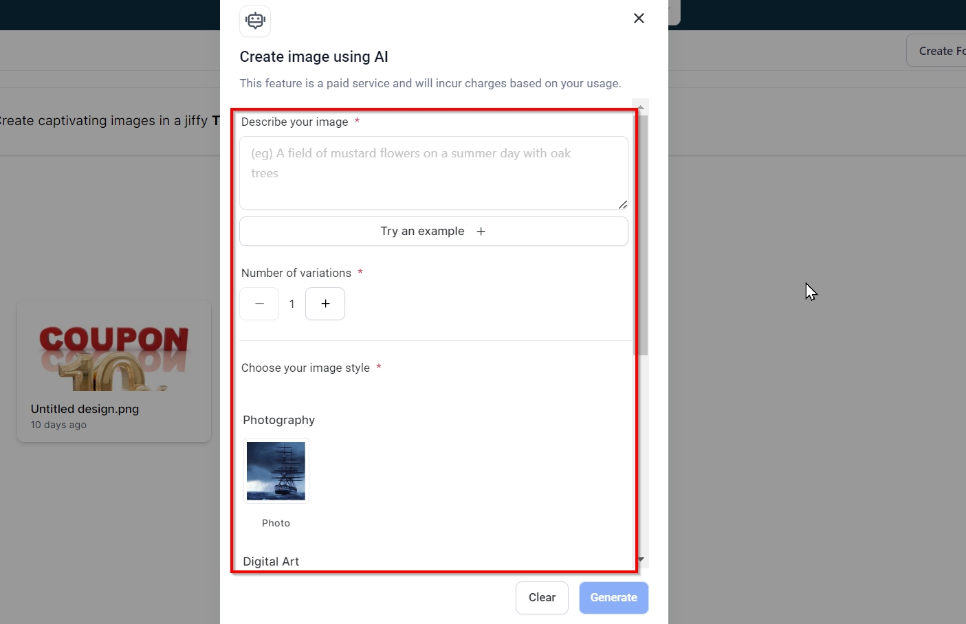 Select Your Image Style: Choose the style for your image. Options include Photography, Digital Art, and Fine Art. After selecting your preferred style, click "Generate" to have the AI create your image.