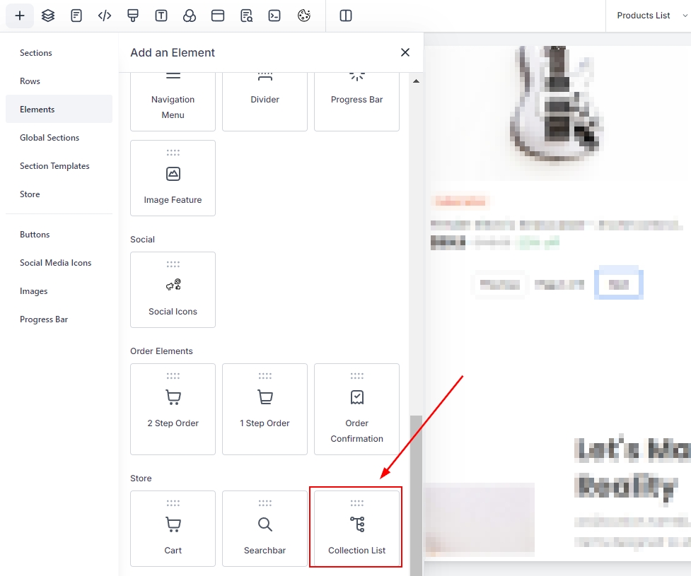 In the Website Editor click the + sign to open the Elements Menu, the Collections list will be under Store.