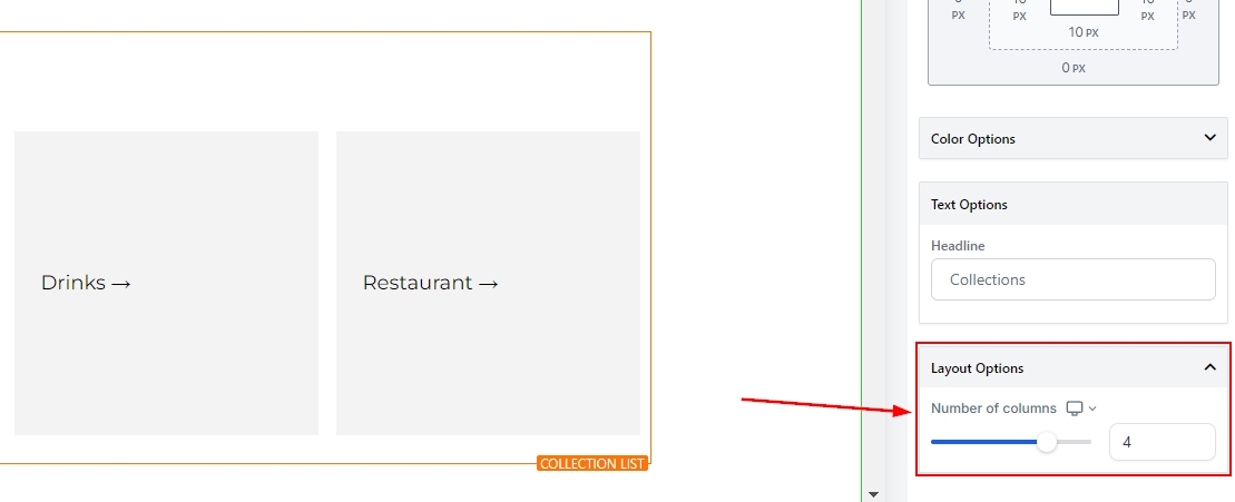 By default, 3 collections are shown per row for desktop and 2 for mobile. You can add more by editing the Layout Options, the maximum would be 5 and 2 columns for desktop and mobile respectively.