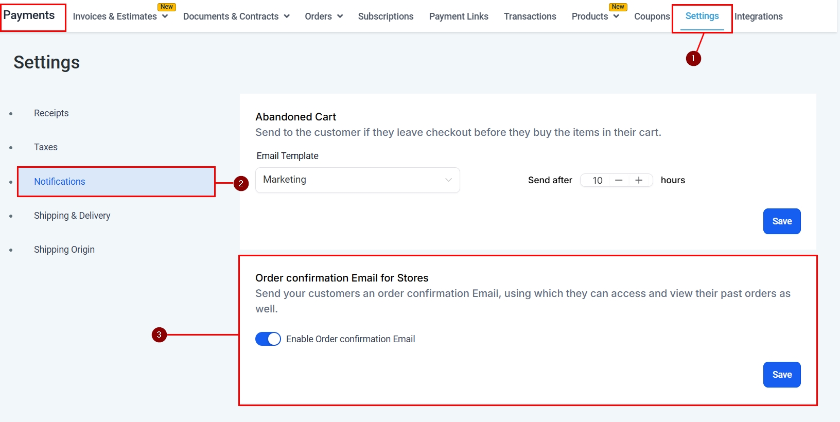 To allow customers access to their order details, enable the Order Confirmation Email feature. This can be done by navigating to Payments > Settings > Notifications > Order Confirmation Email for Stores.
