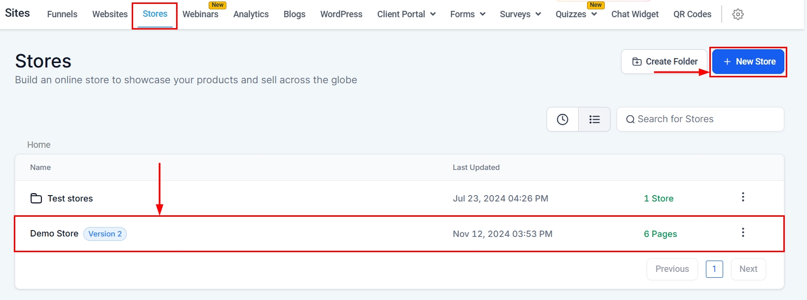 Navigate to the Sites > Stores section in your account, and proceed to create a new store, or click an existing store to modify it.