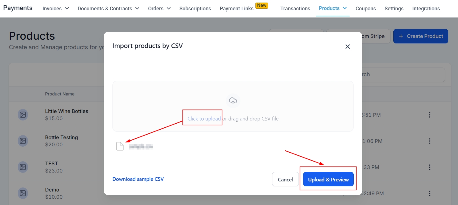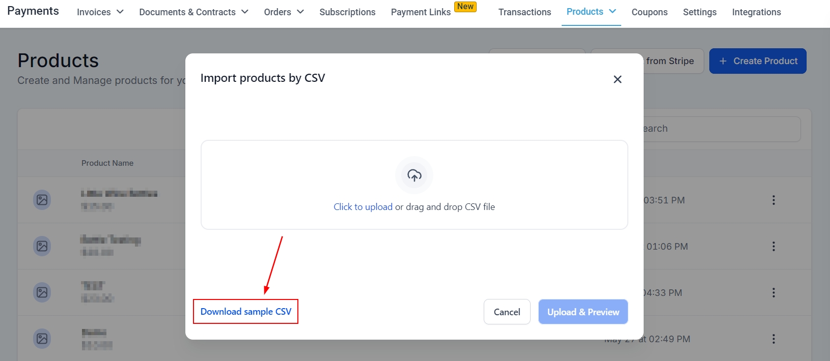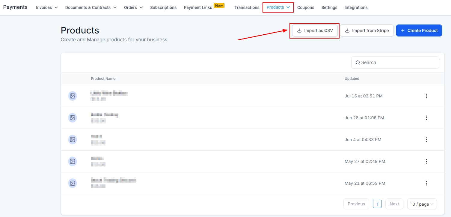 With the help of this guide, you and your team can minimize the effort and move all your products over at once. To start go to the Products tab inside the Payments section and click Import as a CSV.