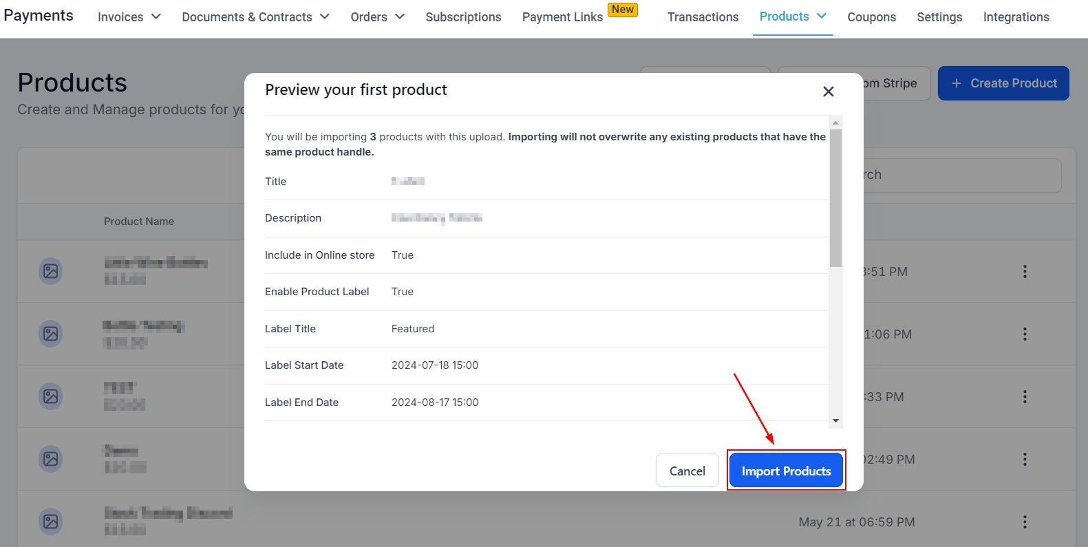 This will use the first product in the list to show you a preview of how the products will look inside the system. If you're happy with the view click Import Products to continue.