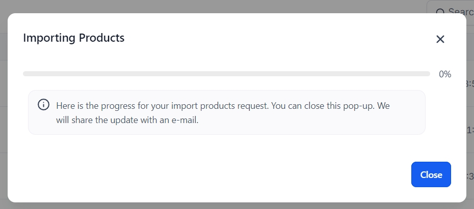 It takes a moment for the system to import the products so a popup will be displayed to help you keep track of the process.