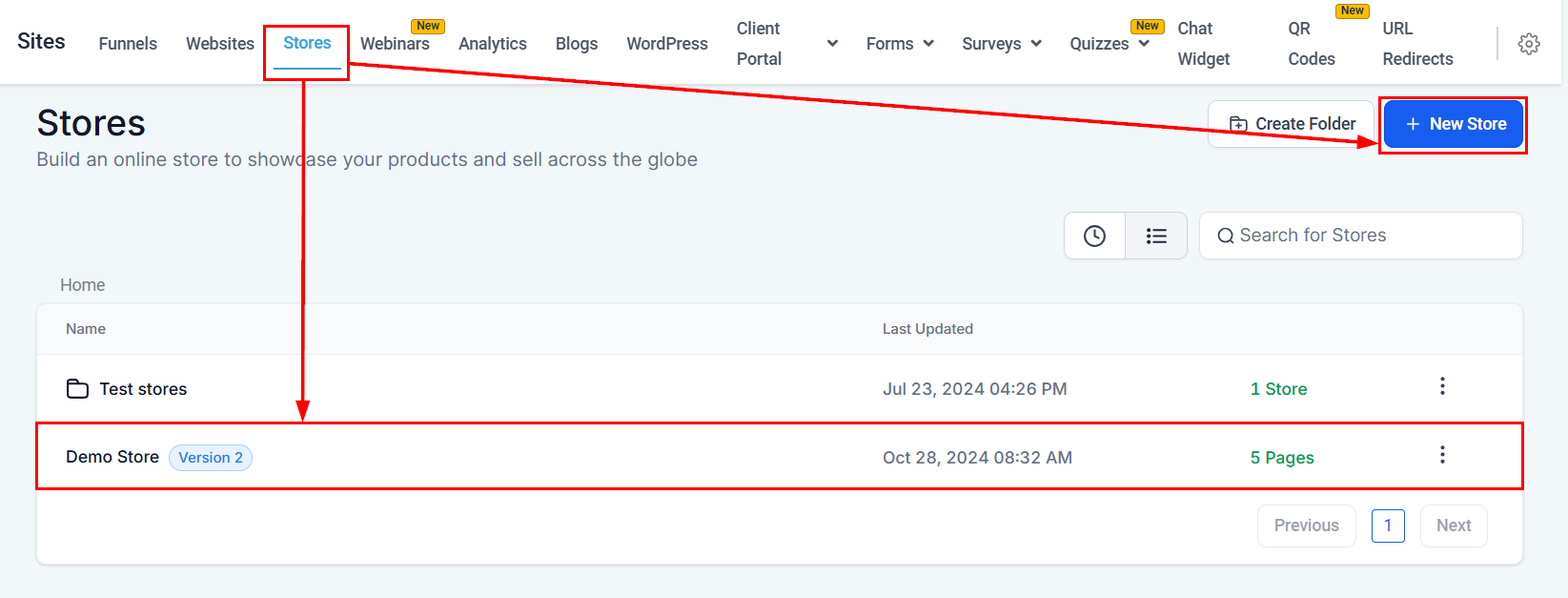 Begin by either opening an existing store or creating a new one within the Sites section of your account.