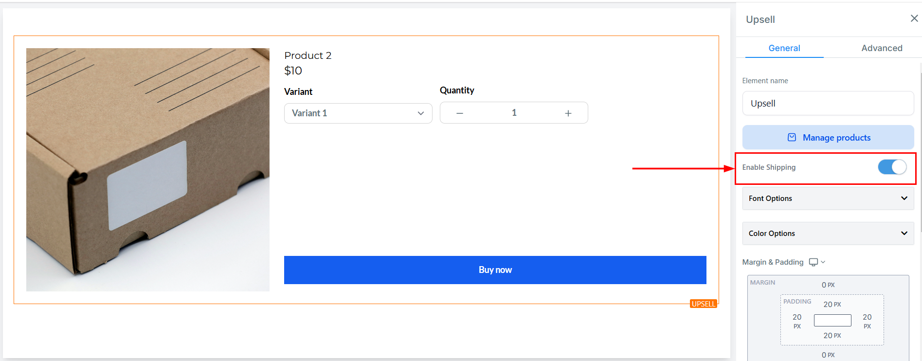 Select the upsell element to access its configuration settings. You will have the option to enable or disable shipping charges for each upsell product by toggling the setting within the builder preview. When enabled, customers will have the option to choose from available shipping rates in a dropdown menu.