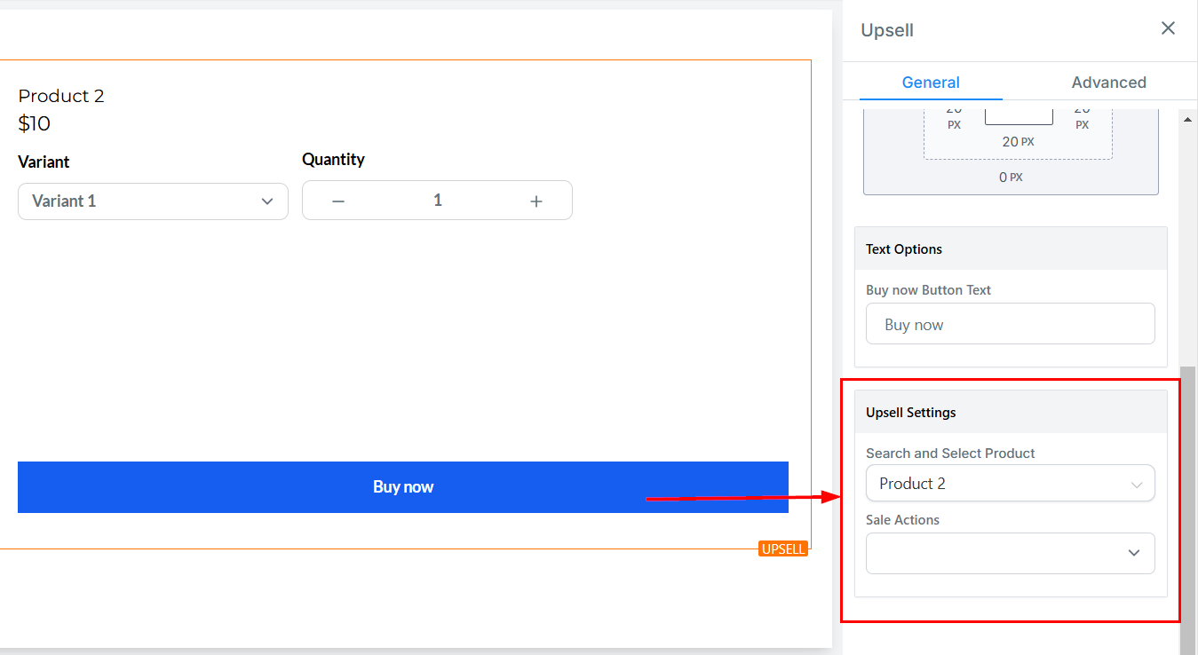 In the Upsell settings, search and select the desired product. Then, configure the Sale Action, which determines the redirection after the "Buy Now" button is clicked. Options include redirecting customers to another upsell page or the Thank You Page.