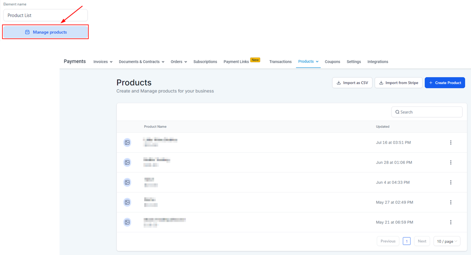 Open the settings to the right side, by clicking on Manage Products you will be redirected to the products tab to edit or create more.