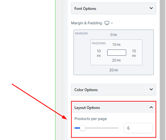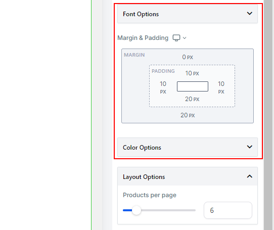 Font options let you control the look of the text related to products, you can use Google Fonts to personalize this. You can also customize the Margin & Padding and the Colors of the element.