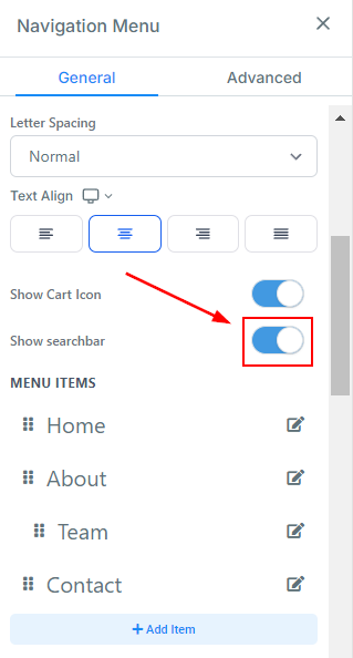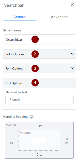 Once it's added please scroll down in the General settings and toggle Show Searchbar on. This will add it to the right corner of the element.