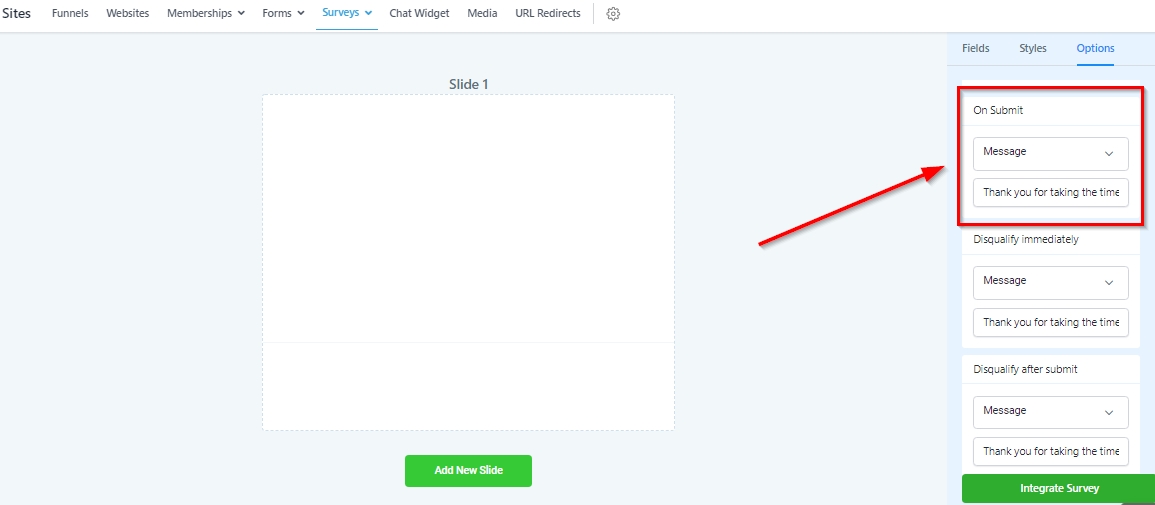 Message: If you choose this option, your visitor will see a message after submitting the survey and remain on the same page. You will need to add a message in the input section for this to take effect.