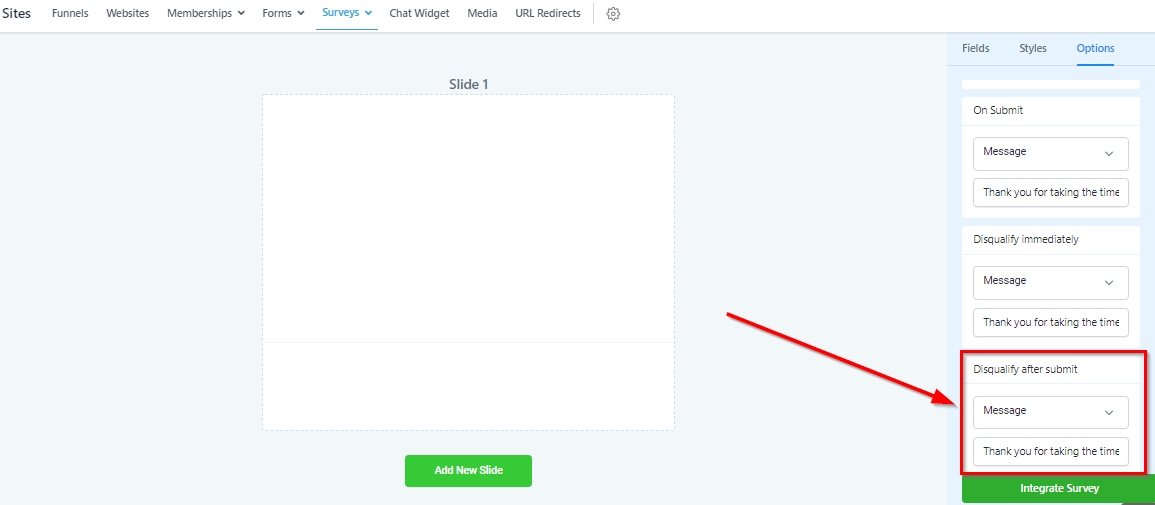You also have the option to "Disqualify After Submit" when a visitor chooses a specific answer. This will allow the visitor to finish the entire form but be disqualified at the end.