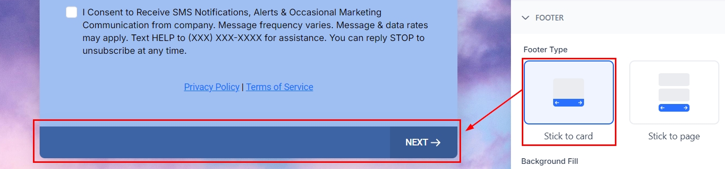 Stick to Card: This footer type will be part of each survey page, this will not show the progress of the survey instead it will prompt the responders to continue.
