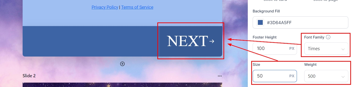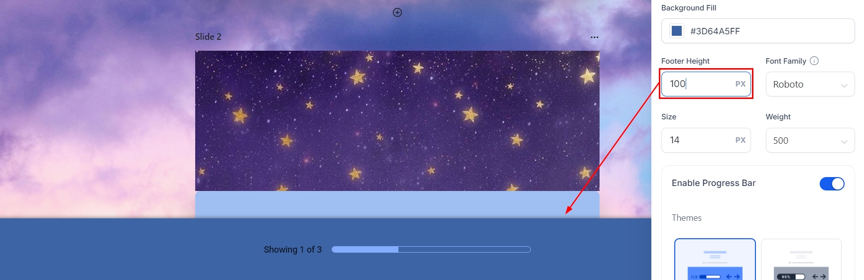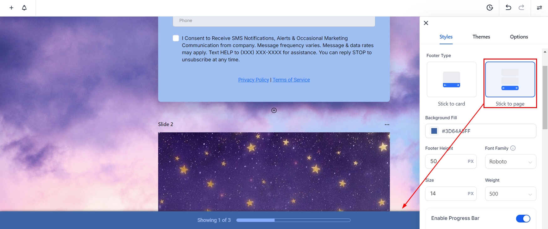 Stick to page: This will keep the footer at the bottom of the page regardless of the step they are on and you can select to display the progress for the survey by step or percentage.