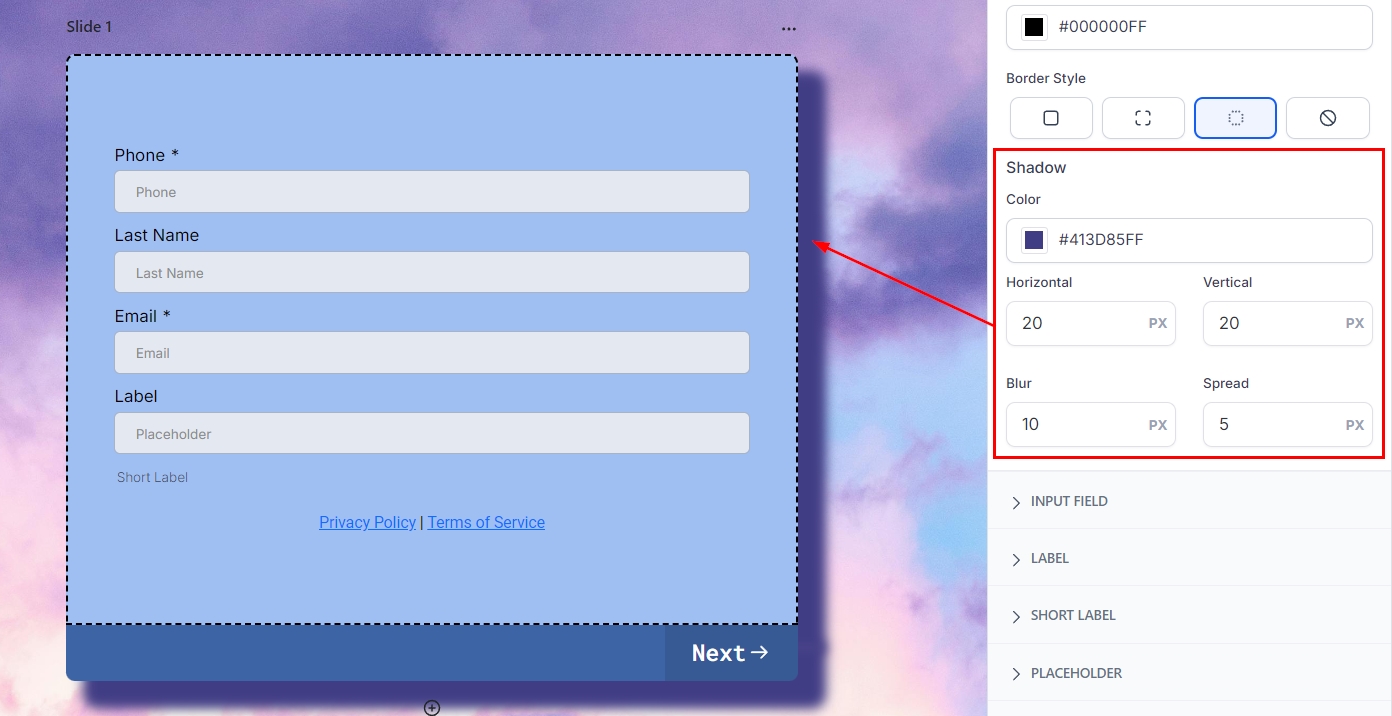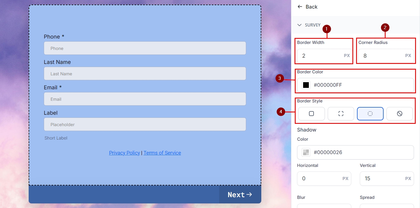 Shadow: These options allow you to give additional depth to your survey/fields. The horizontal and vertical fields set the size, Blur sets the opacity, and Spread limits how far the shadow should extend.