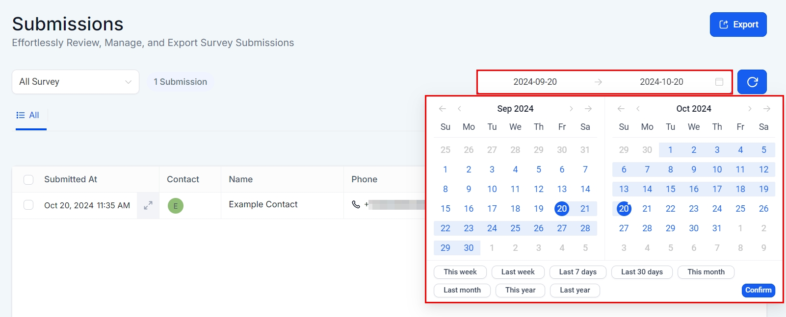 To filter survey submissions by a specific time frame, click on the date bar in the upper-right corner of the page. You can choose from preset options or specify a custom date range. Once selected, click Confirm to update and view the submissions list within the chosen range.
