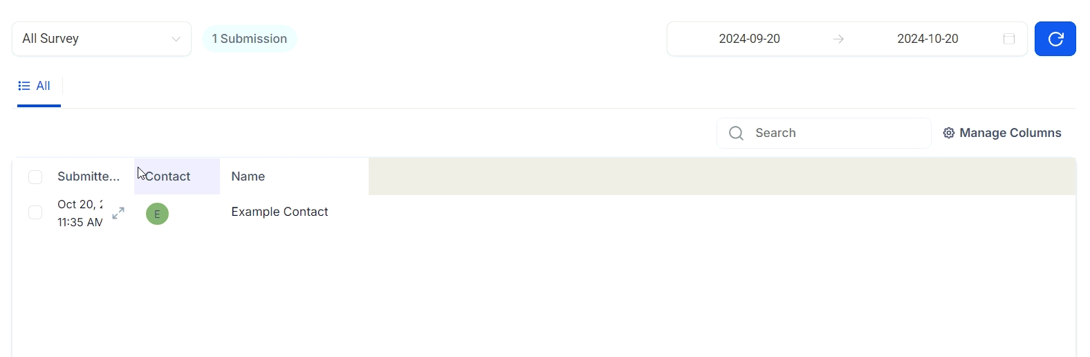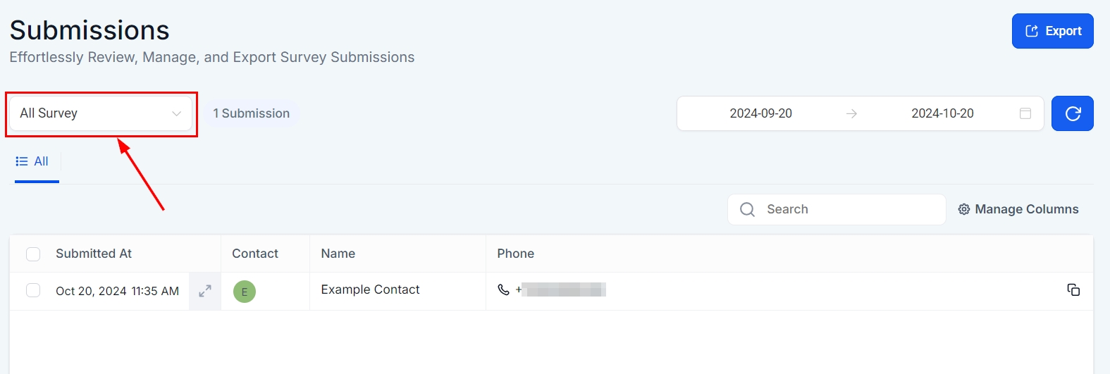 From the All Survey dropdown, select a particular survey whose submissions you wish to view. Alternatively, you can view all survey submissions when the “All Survey” option is maintained.