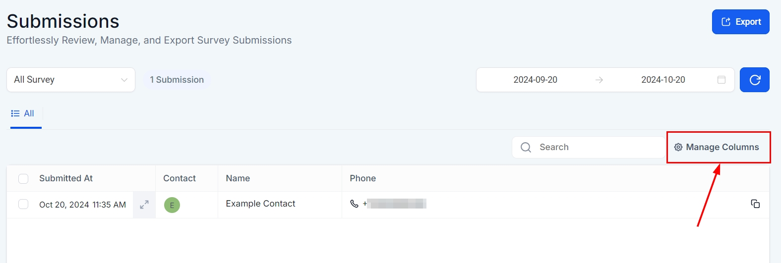 Select the Manage Columns option to control the columns displayed in the Submissions table.