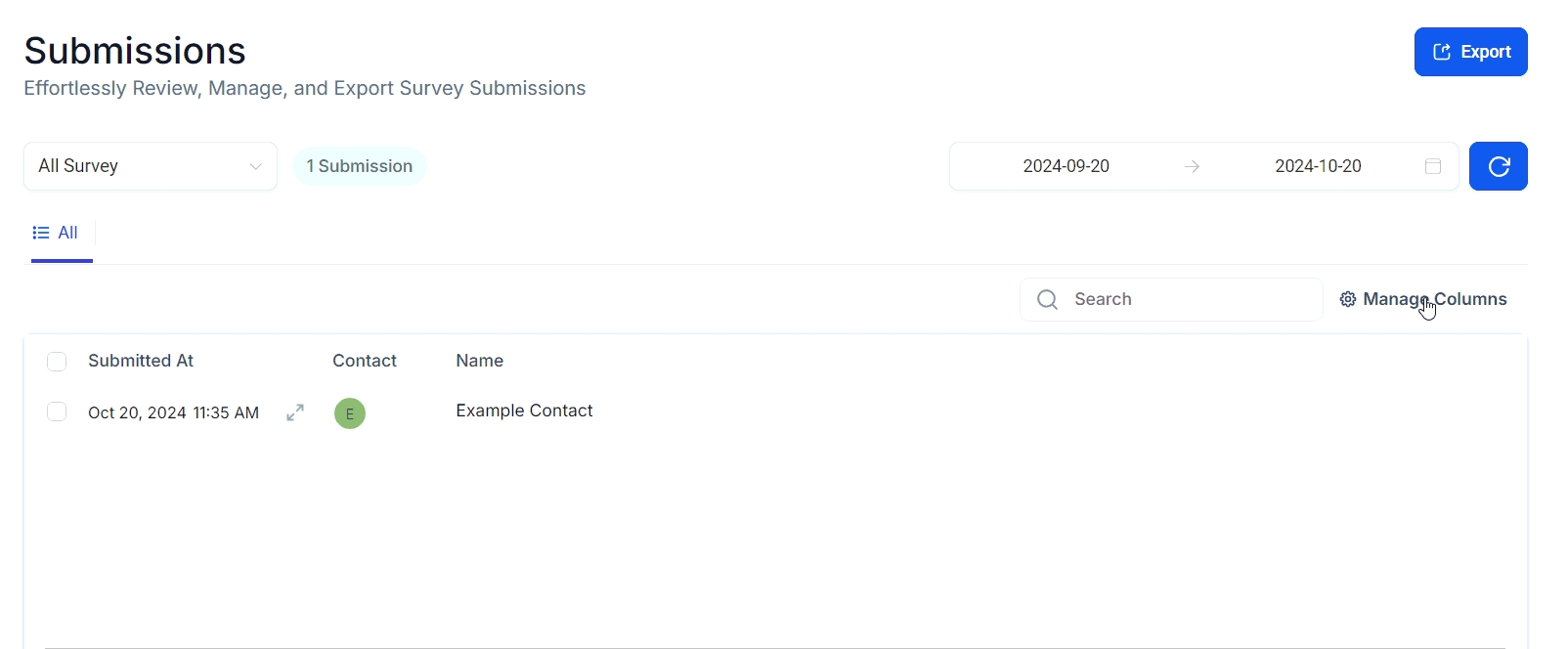The Survey Submission Table displays all submissions for a selected survey, or all surveys if no specific one is selected. Key submission details, such as the respondent's name, email, and submission date, are shown prominently for each entry unless the columns are adjusted.