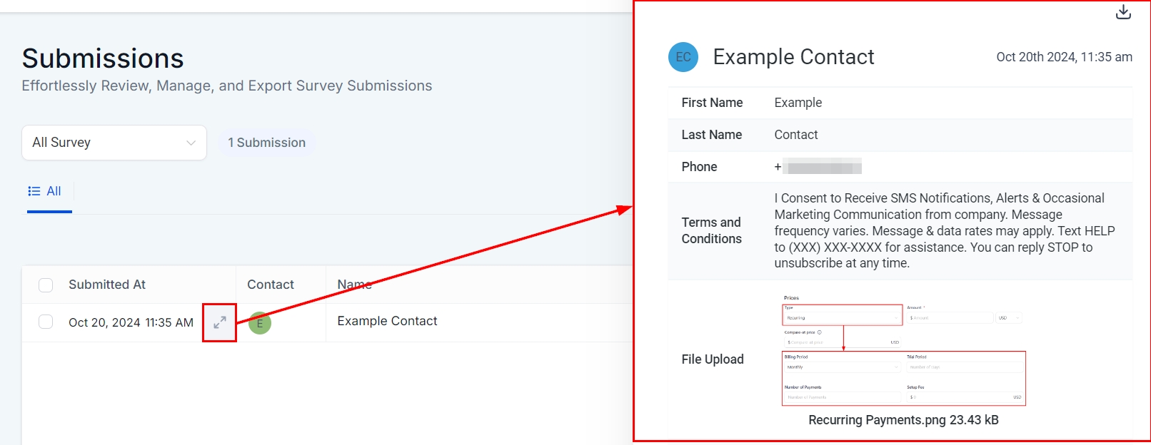 Click on the expand icon to view an individual submission. By selecting an entry from this list, you can view the full submission details on the right-hand side.