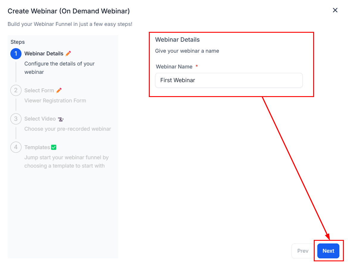 You will then be prompted to provide a name for your webinar in the Webinar Details step.