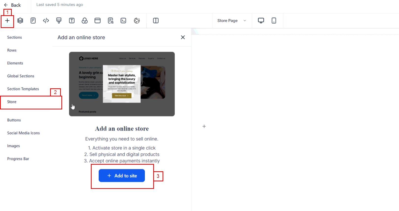 Go to the store tab and click on “+Add to site” to initiate your store setup.