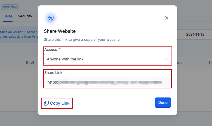In the Popup, you can set who has access to the website and also a shareable link. Use the website URL to send traffic to your website. This URL will always take visitors to the first page of your website.