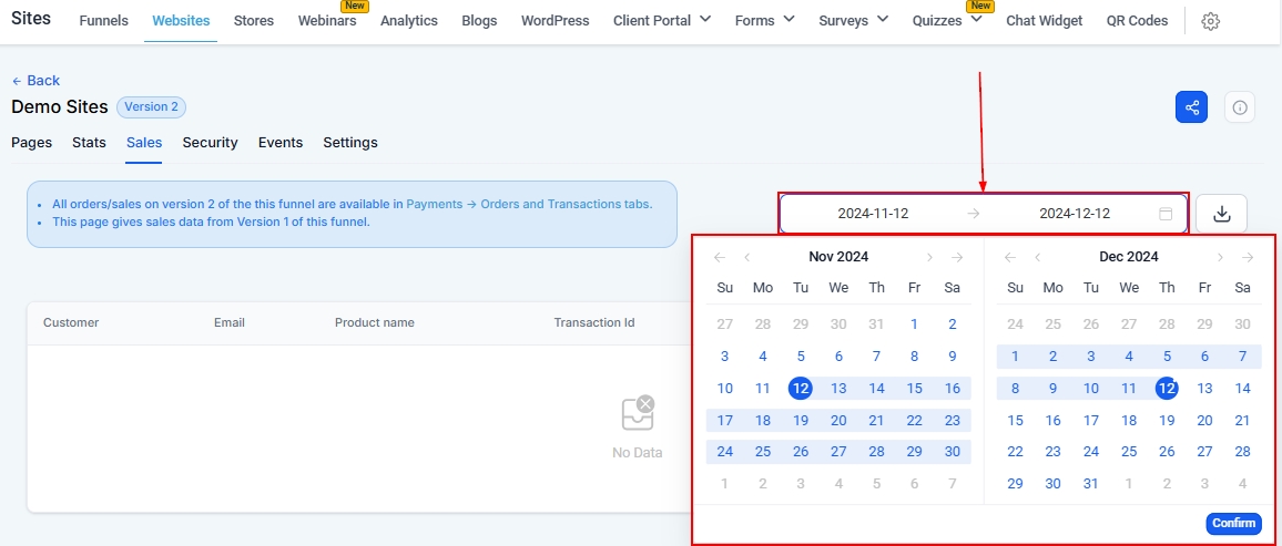 Here you can filter the data by adjusting the date range of this data. Click on the date range icon to drop down the calendar menu, then select the range you want to work with and click Confirm the setup.