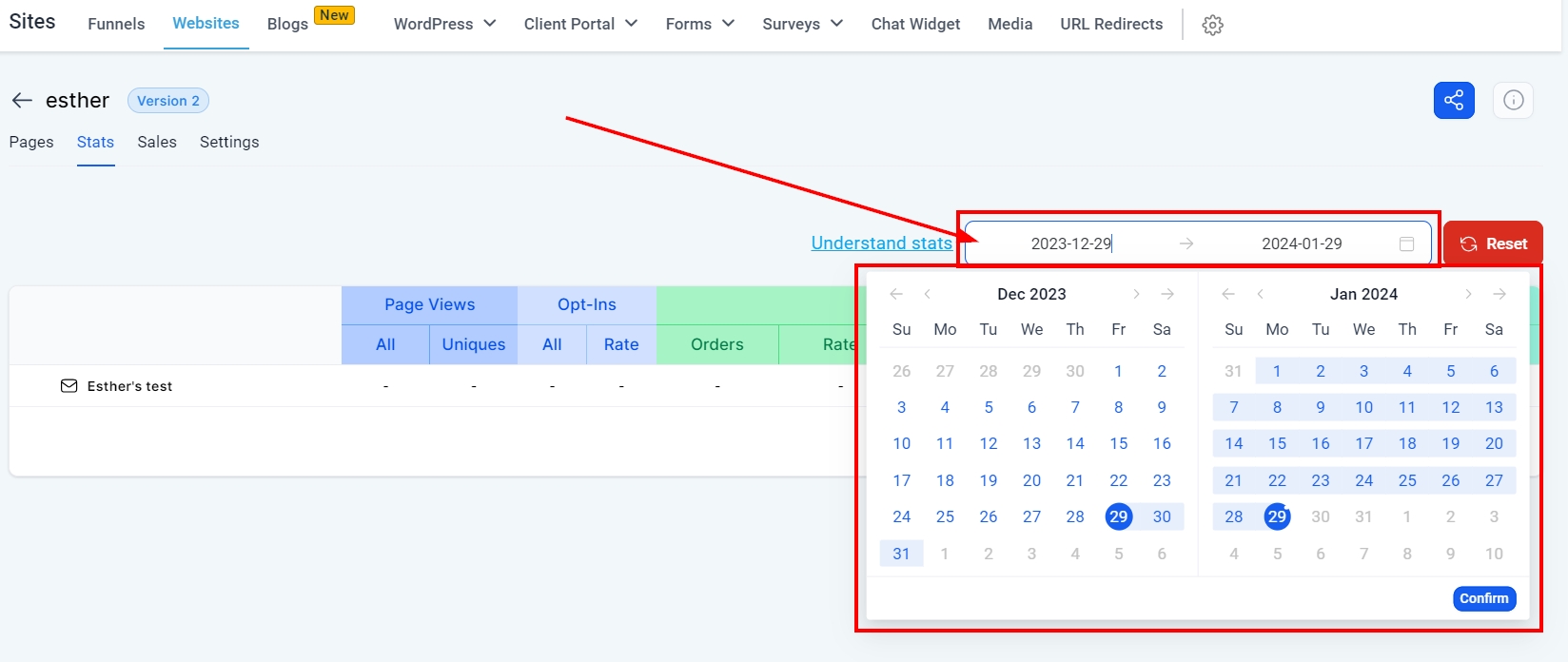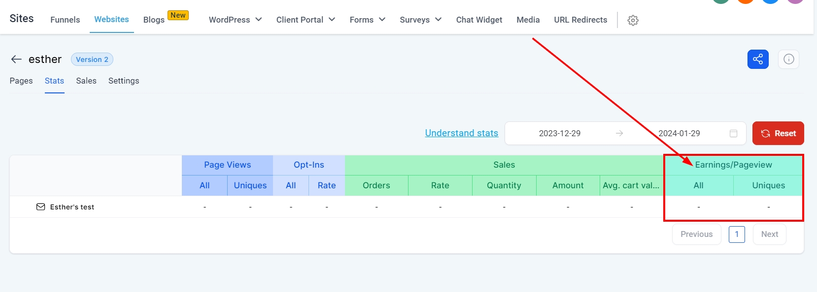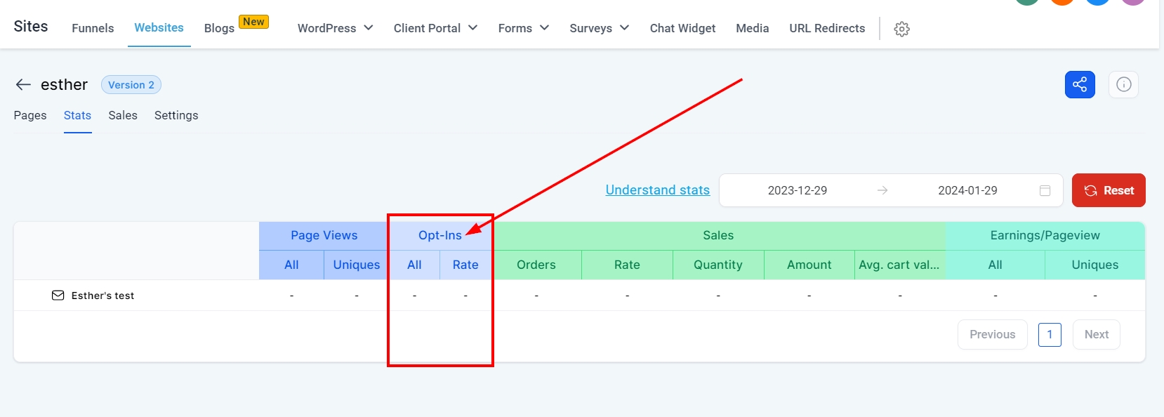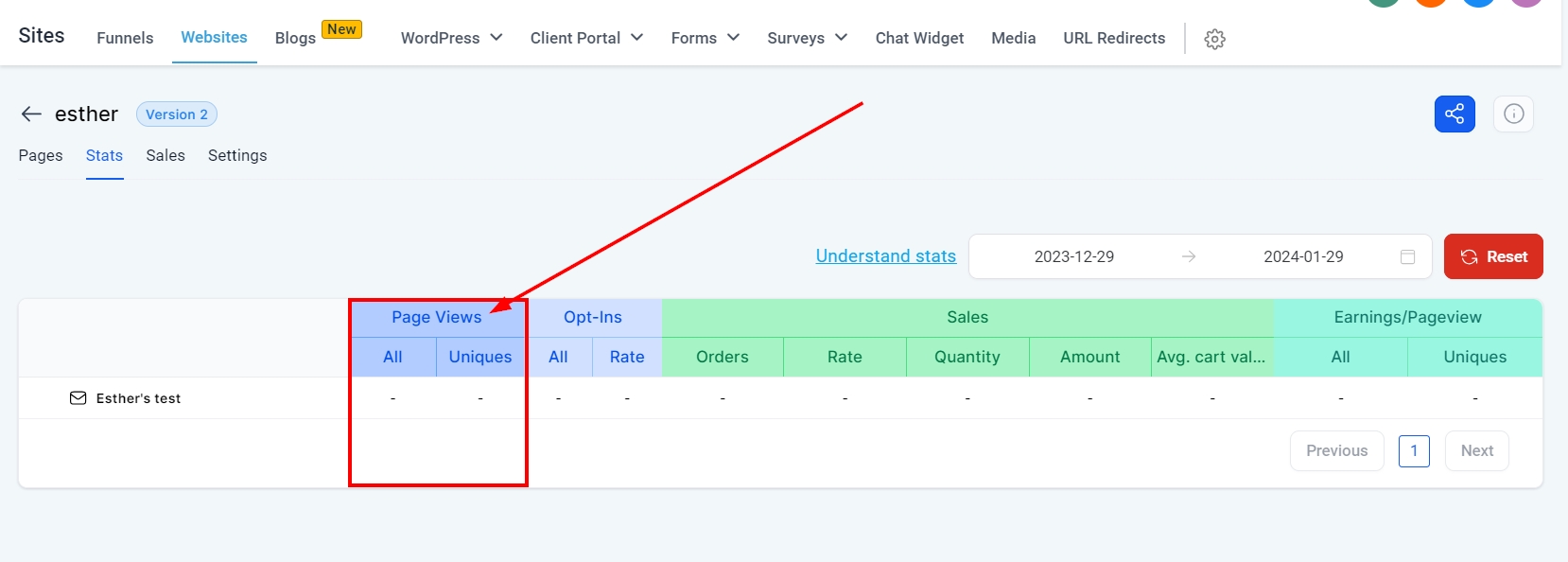 The "Stats Tab" shows you the statistics of each step created on a website. It shows you the number of visitors that opened a specific page of your website and the actions they performed on each page.