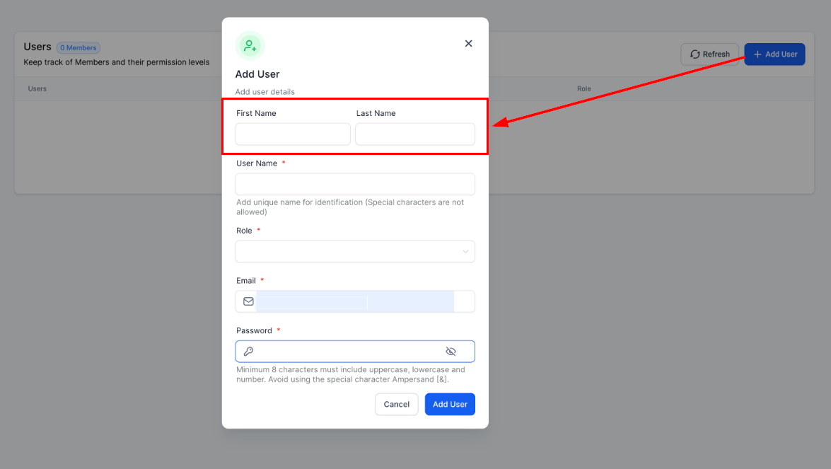 This will open a modal where you can input the user details.