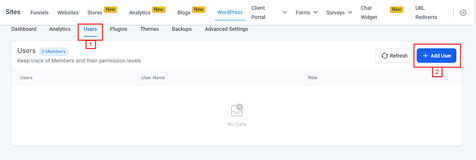 User profiles can be added from the Users section of the WordPress tab. Click the โAdd Userโ button to add a new member to your site.