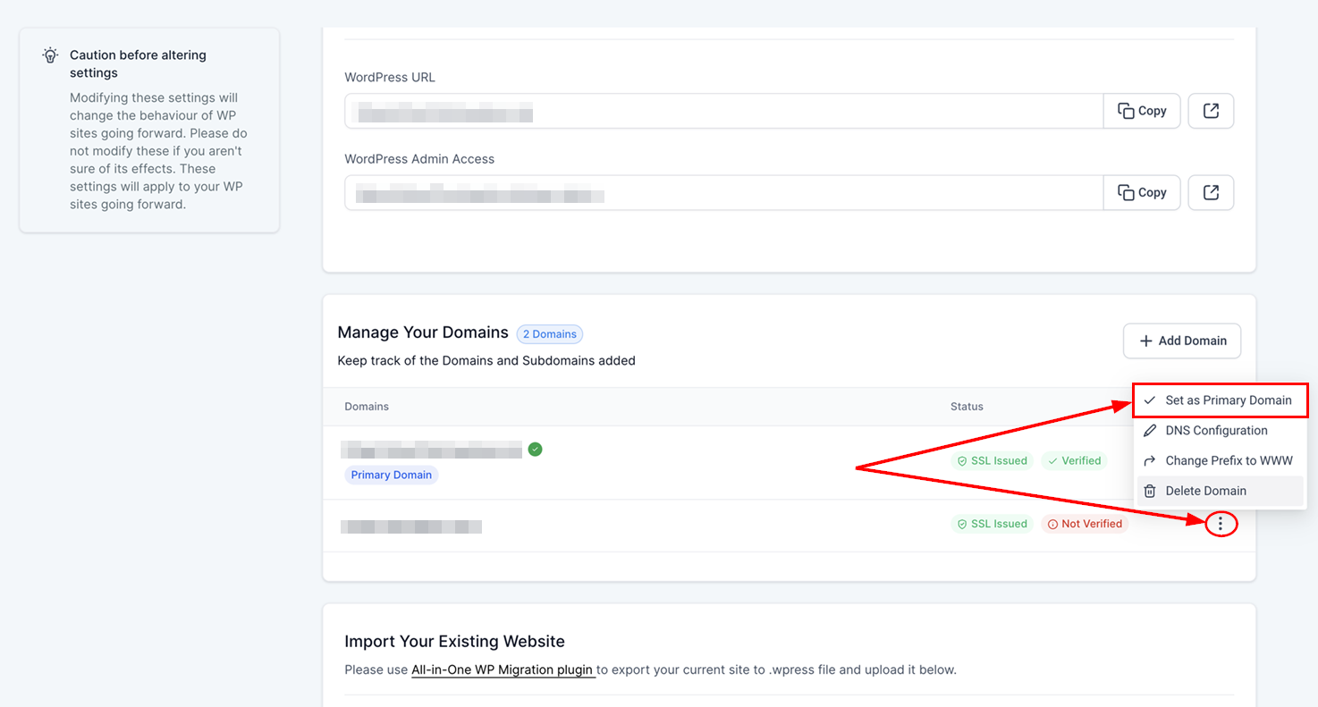 Then, change the prefix to www from the actions dropdown menu if necessary, and proceed to set it as the primary domain.