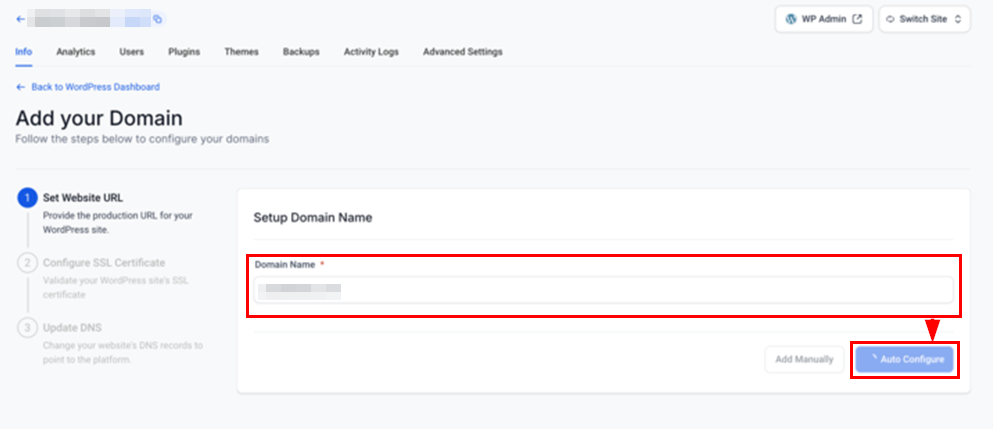 Next, input the domain name you want to connect to your WordPress site, then click Auto Configure to initiate the automated setup.