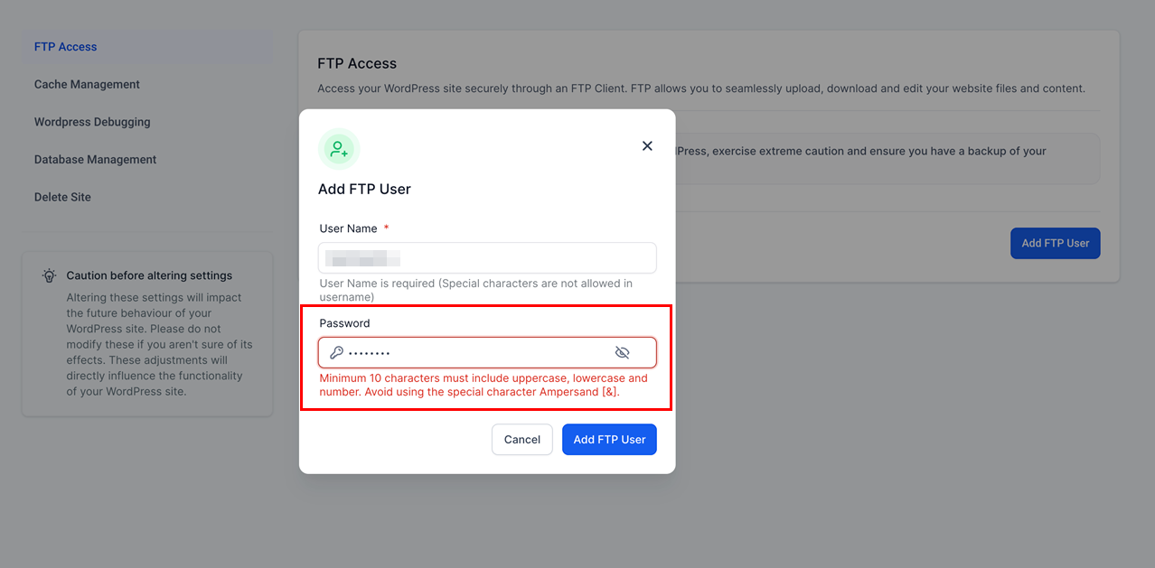 WordPress hosting management features enhance site administration, security, and flexibility. Highlights include streamlined domain management with the Domain Connect integration, automated and manual backup options, advanced password security, and flexible user profiles supporting spaces in names. Additionally, the safeguard ensures a new admin is assigned before deleting an existing one, providing a secure and user-friendly hosting experience.
