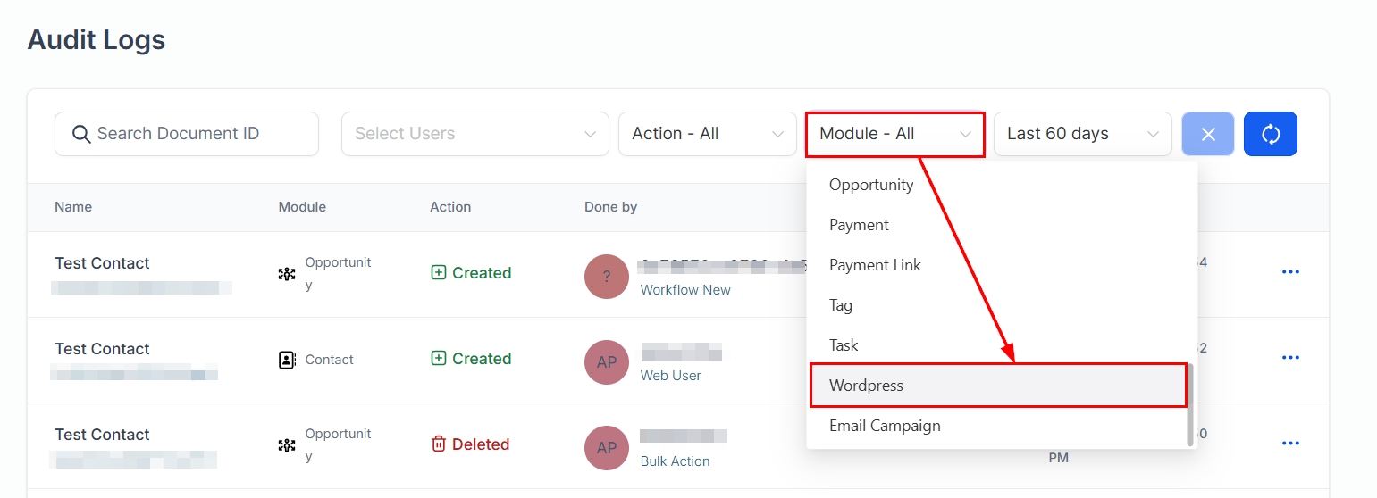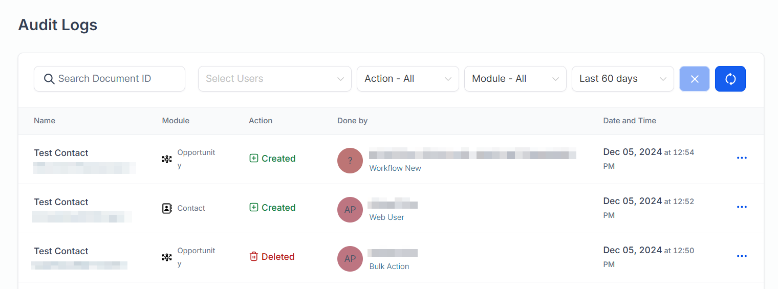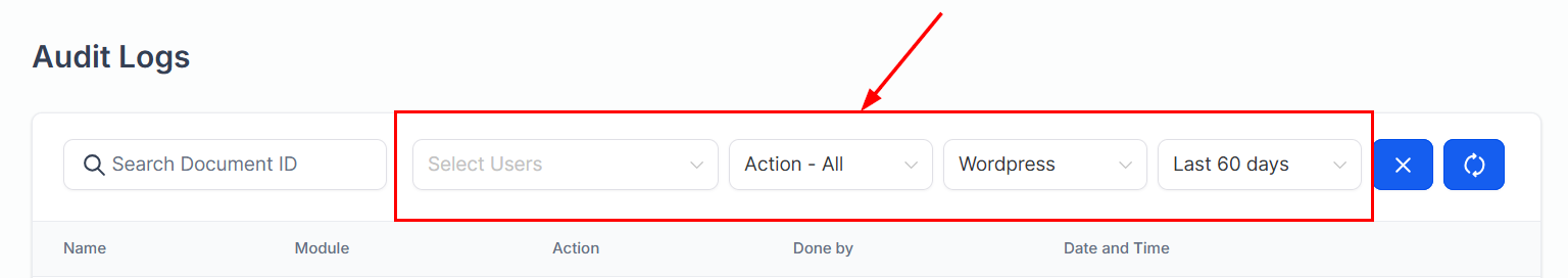Refine the logs by applying additional filters such as the user who performed the action, action type, or period.