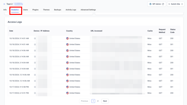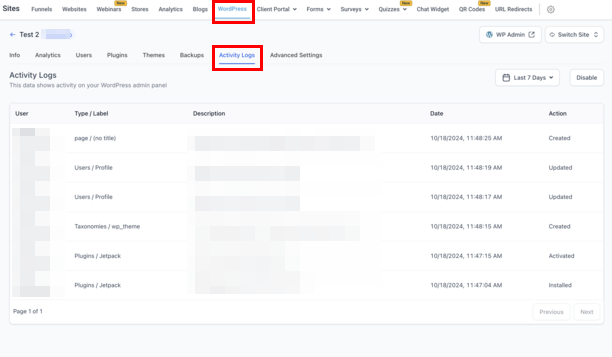 These Logs can also be viewed in the Sites > WordPress section of your account within the Activity Logs tab! Apply filters if necessary to view data in a selected time frame.