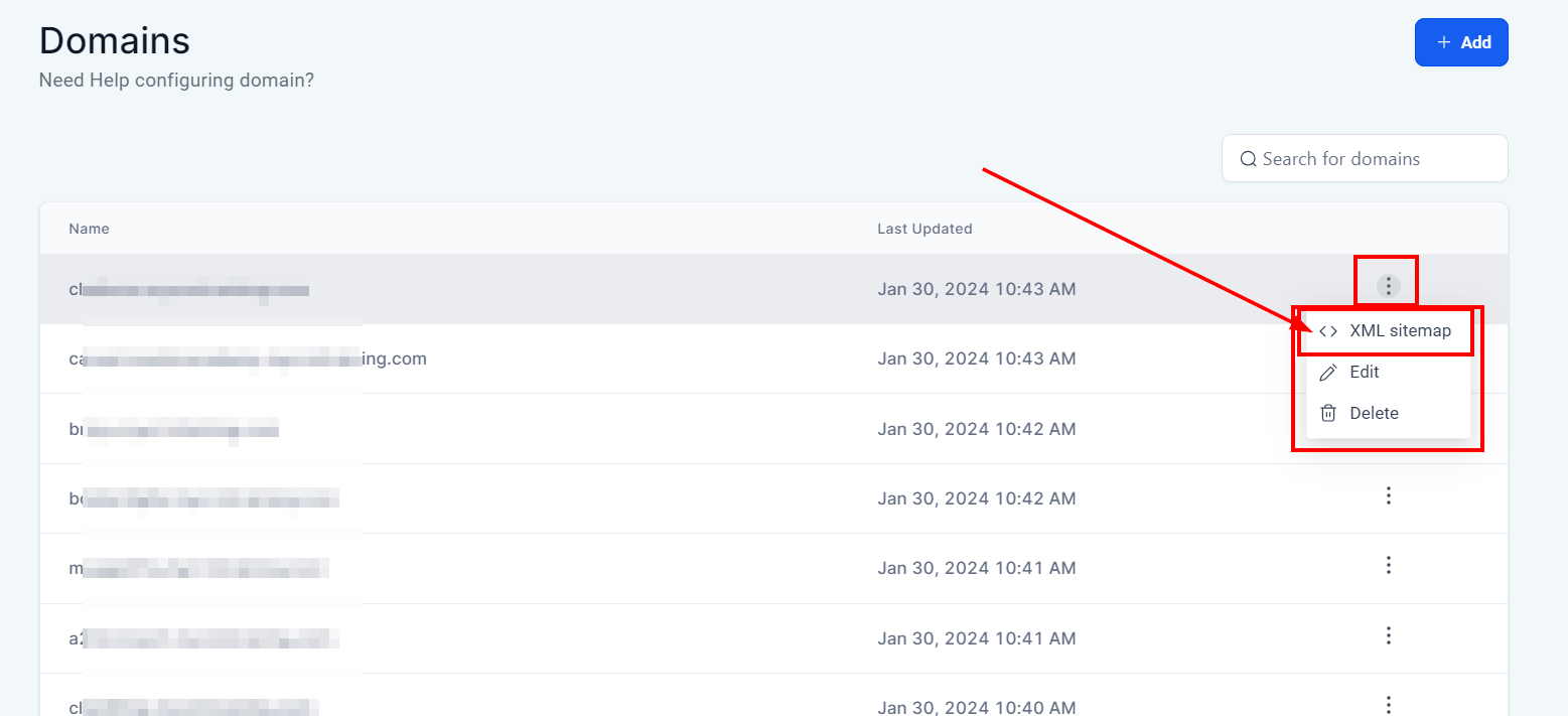 Next, locate the specific domain you'd like to add the sitemap to and click on the 3-dot menu to access the XML sitemap option. By adding an XML sitemap, you can enhance your website's search engine optimization and improve its overall visibility.