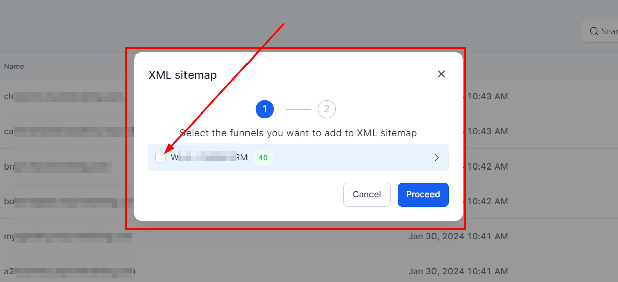 When you click on XML sitemaps, it will open a popup with the sitemap generator that will show you any websites or funnels attached to the domain that you can select or deselect. If you open up a funnel or website, it’ll show you the pages within it and you can select or deselect the pages you want included in the sitemap. Hit the Proceed button