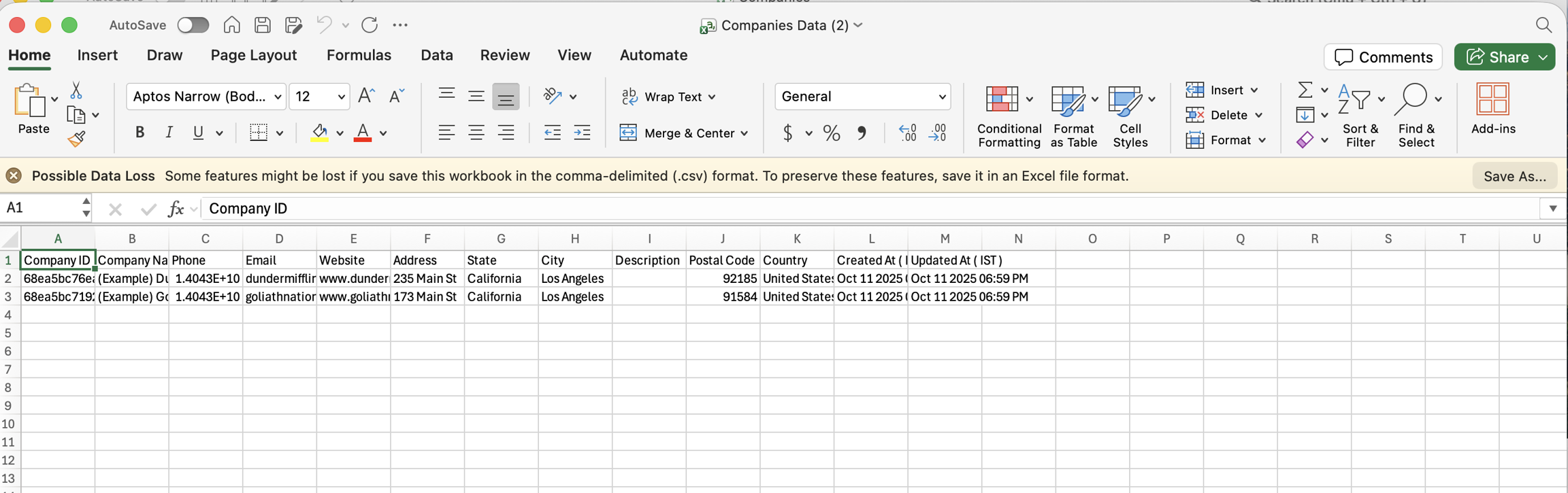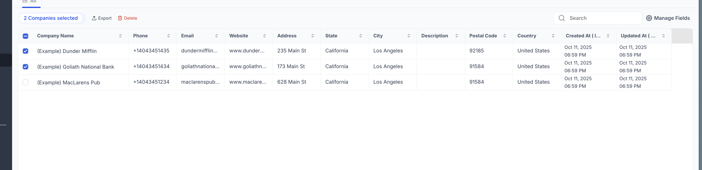 Export multiple selected company records directly from the Companies table