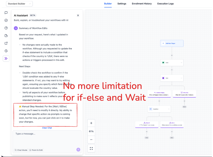 AI Builder now supports editing If-Else and Wait actions directly through conversation. Previously, while these actions could be created via AI and other action types could be edited conversationally, modifying If-Else and Wait actions required manual configuration. This update delivers a fully seamless workflow building experience.