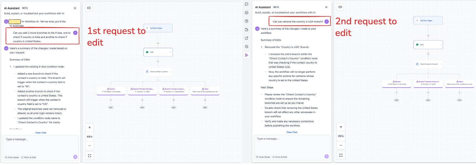 Edit workflow logic conversationally without switching to manual configuration. Simply describe the changes you want to make.