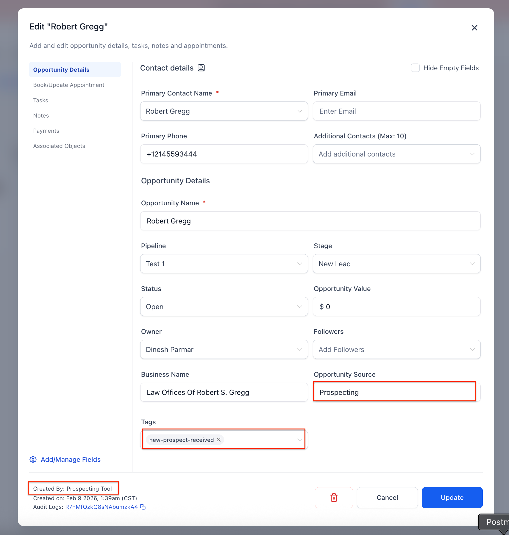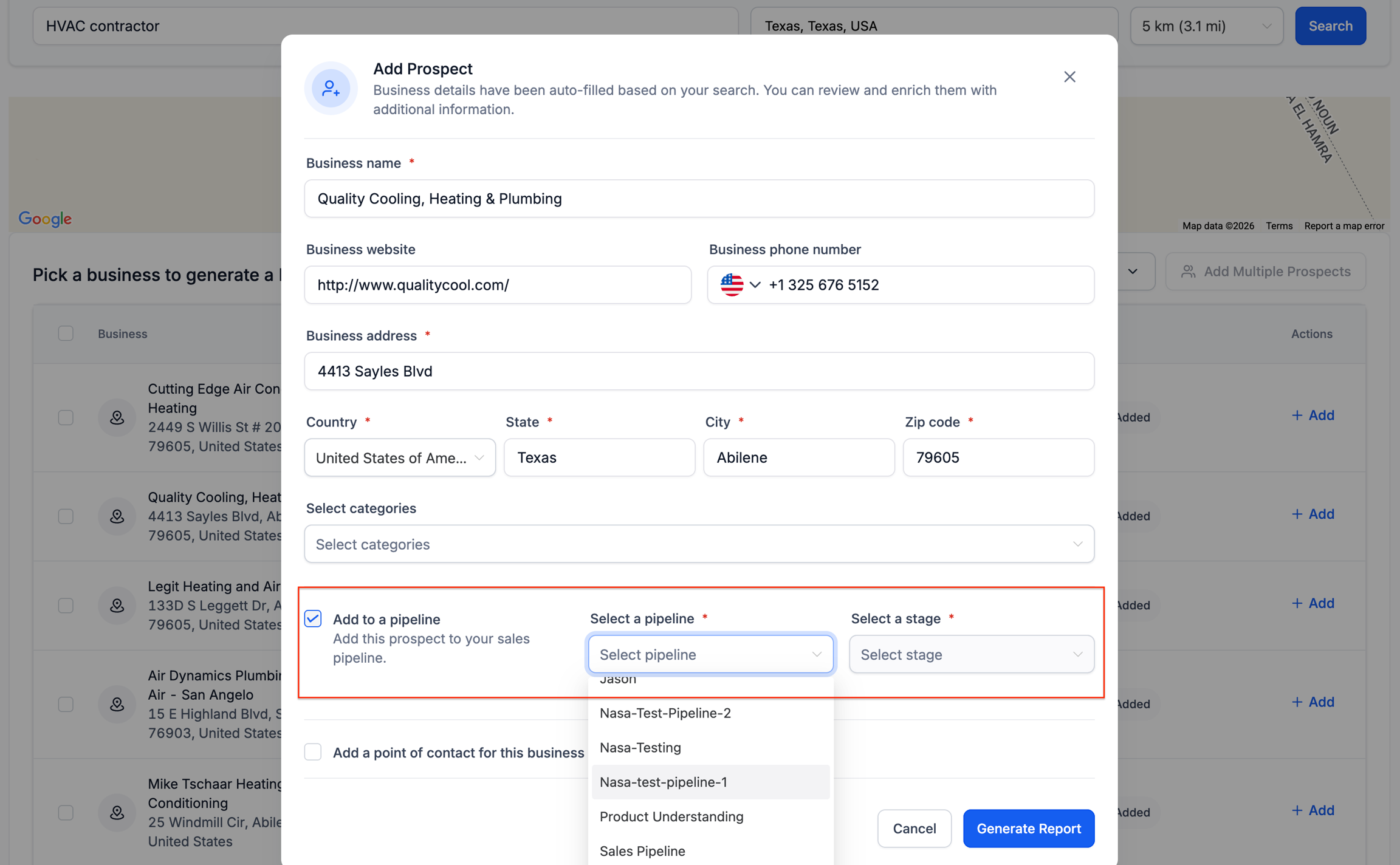 You can now send new prospects directly into your sales pipelines from the Prospecting Tool — making it easier to move from discovery to deal management without manual steps.